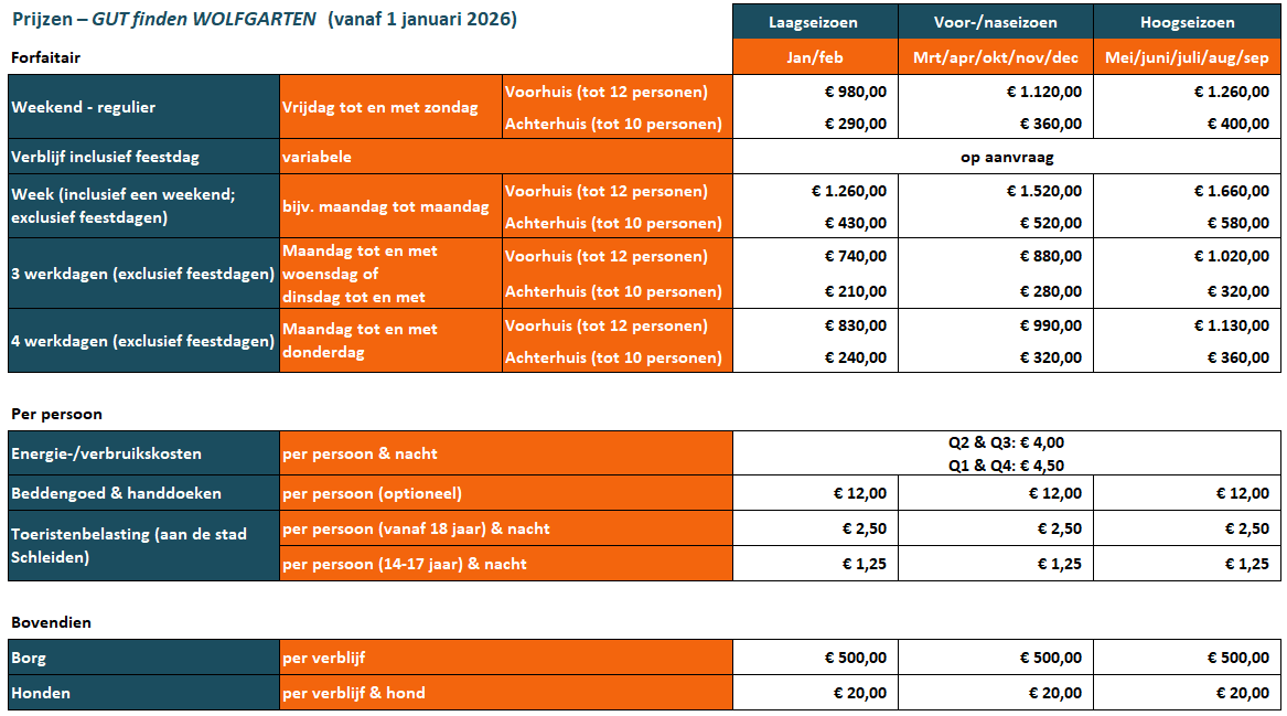 De GUT finden WOLFGARTEN is een voormalig hotel-restaurant. Het voorhuis biedt plaats aan maximaal 12 personen. Indien gewenst kan het achterhuis, dat plaats biedt aan nog eens 10 personen, ook worden geboekt. Voor- en achterhuis hebben hun eigen ingang. Als beide delen van het huis bezet zijn, staat een binnendeur open.